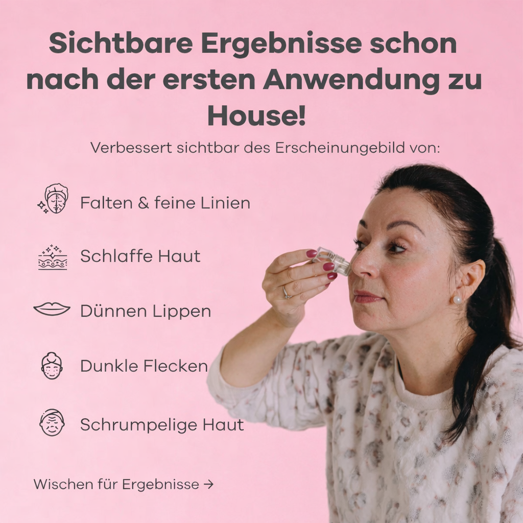 Ja, es kann in mehreren Bereichen angewendet werden, in denen Zeichen der Hautalterung auftreten. ⚠️ Vermeiden Sie die Anwendung zu nah an den Augen (halten Sie ca. 3 cm Abstand). Für die Lippen: sanft andrücken, um sie zu hydratisieren und aufzufrischen.